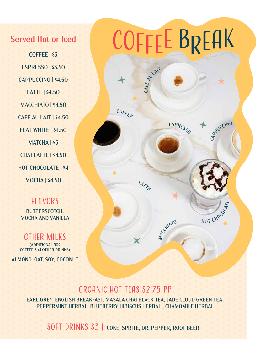 EARL GREY, ENGLISH BREAKFAST, MASALA CHAI BLACK TEA, JADE CLOUD GREEN TEA, PEPPERMINT HERBAL, BLUEBERRY HIBISCUS HERBAL , CHAMOMILE HERBAL