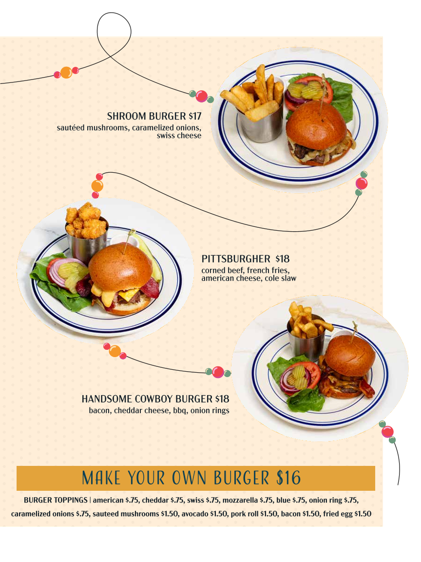 - Burgers: The Handsome Cowboy Burger comes loaded with bacon, cheddar, and BBQ sauce, delivering rich flavor in every bite.