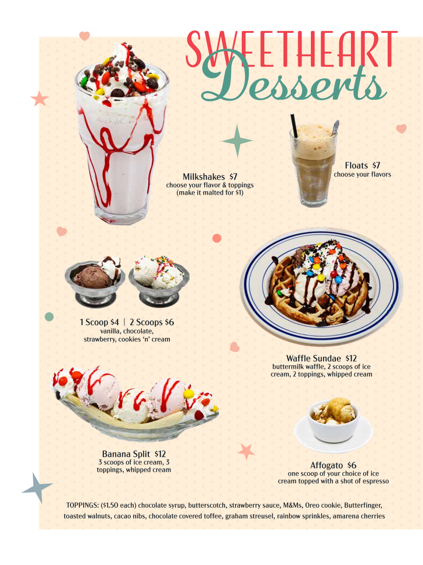 buttermilk waffle, 2 scoops of ice cream, 2 toppings, whipped cream