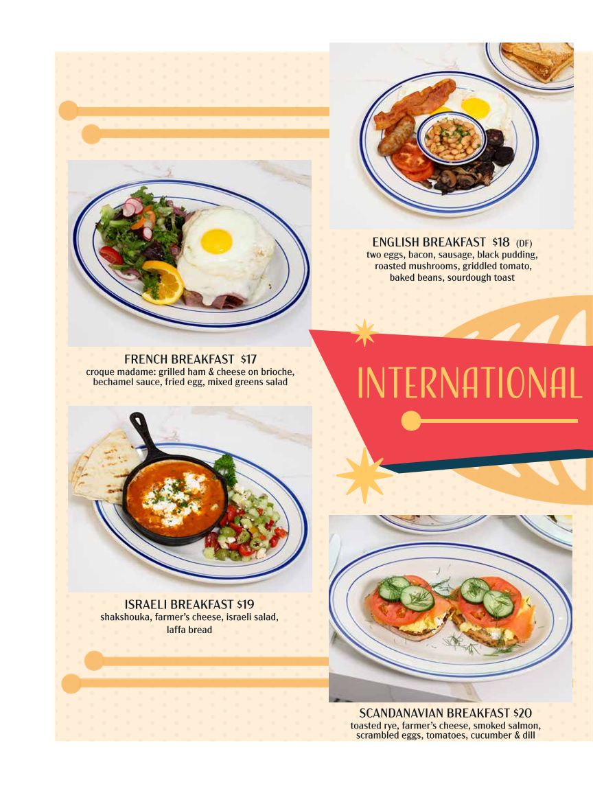 toasted rye, farmer's cheese, smoked salmon, scrambled eggs, tomatoes, cucumber & dill
